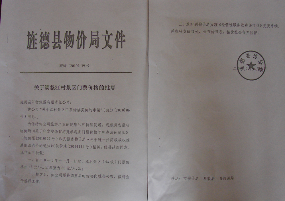 江村景區價(jià)格調整公告       為了進(jìn)一步加強江村景區旅游資源的開(kāi)發(fā)利用、建設和保護,提高江村品牌效益,促進(jìn)江村景區旅游事業(yè)健康、快速發(fā)展;旌價(jià)【2010】39號《關(guān)于調整江村景區門(mén)票價(jià)格的批復》,江村門(mén)票自2010年11月1日起,票價(jià)由48元/人·次,調整為60元/人·次,調整后的門(mén)票價(jià)格于2011年3月10日起正式執行,對旅行社團隊價(jià)、業(yè)務(wù)單位協(xié)議價(jià),江村景區將調整新的協(xié)議價(jià),屆時(shí)江村景區將與各單位重新簽訂合作協(xié)議。特此公告。  附:旌德縣物價(jià)局《關(guān)于調整江村景區門(mén)票價(jià)格的批復》                                                                         2010年9月16日                                                                  江村旅游有限責任公司