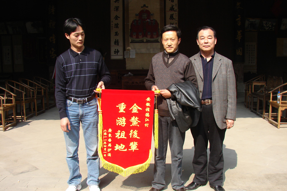 2011年4月1日,江村景區迎來(lái)了一批共60余人的特殊的客人,他們是廣東番禺沙涌村江氏后裔(明代江永慶的后輩),特別趕在清明節前夕來(lái)江村認祖的。此次認祖團隊的組織者叫江始雄,乃沙涌村江詒燕堂負責人。之前一直聽(tīng)說(shuō)自己的祖上是浙江奉化和江西的,后來(lái)聽(tīng)村里的老人說(shuō)是安徽旌德江村的。就這樣江始雄于2005年10月份帶領(lǐng)村里的9名江氏后裔踏上了旌德江村認祖的道路,并贈送了錦旗,之后又于2007年、2009年共三次來(lái)旌德江村祭祖,這次是第四次了,他說(shuō)爭取每?jì)赡陙?lái)江村一次。此次龐大的認祖團隊得到了沙涌村書(shū)記江少泉、村長(cháng)江展行大力支持,二位村領(lǐng)導也隨團來(lái)到了旌德江村。    這次來(lái)江村認祖的近60名江氏后裔,基本上是第一次來(lái)旌德江村,原本安排景區導游引獅山古廟、聚秀湖路途景點(diǎn)一路講解,可是大家認祖心切,等不及的要趕到祠堂參觀(guān),大家首先來(lái)到他們祖上祠堂(溥公祠)瞻仰祖宗像,因江始雄先生先后來(lái)江村3次,與溥公祠檢票員江丕俄老先生多次交談過(guò)(2005年來(lái)江村尋宗的時(shí)候,就是江老找出了金鰲江氏家譜廣東番禺沙涌江氏這一支系的詳細記錄),并請江老取出了祖宗像的真跡請大家瞻仰,大家的心情非常的激動(dòng),其場(chǎng)面無(wú)以言表。之后沙涌村的村長(cháng)向江村旅游公司贈送錦旗:金鰲后輩、重游祖地。
