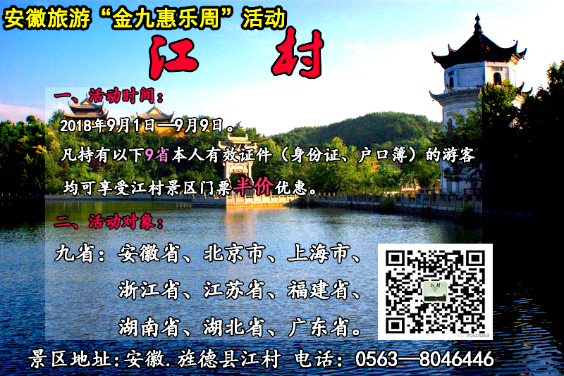 安徽旅游“金9惠樂(lè )周”活動(dòng)   江村景區  一、活動(dòng)時(shí)間:    2018年9月1日——2018年9月9日。凡持有以下9省本人有效證件(身份證、戶(hù)口本、)的游客,均可享受江村景區門(mén)票半價(jià)優(yōu)惠。  二、活動(dòng)對象:   九?。喊不帐?、北京市、上海市、浙江省、江蘇省、湖北省、湖南省、廣東省、福建省。 景區地址:安徽.宣城市.旌德縣江村。   景區電話(huà):0563—8046446