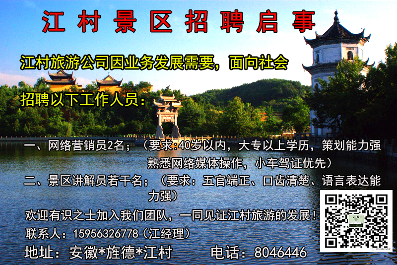 江村旅游有限責任公司(江村景區)坐落于全國特色小鎮白地鎮境內,主要以江村旅游的開(kāi)發(fā)和景區的經(jīng)營(yíng)為主。江村歷史悠久,名人眾多,現為中國歷史文化名村、全國重點(diǎn)文物保護單位——江村古建筑群、國家4A級風(fēng)景區、全國紅色經(jīng)典旅游景區、中國最美古村落、中國傳統村落、江澤民同志祖居地。 因公司業(yè)務(wù)發(fā)展需要,須招聘以下工作人員: 1、網(wǎng)絡(luò )營(yíng)銷(xiāo)員2名;要求:(男性、年齡40歲以?xún)?,大?zhuān)以上學(xué)歷,策劃能力強,熟悉現代媒體的各種操作程序;有小車(chē)駕證的優(yōu)先;工資面議)。 2、 景區講解員若干名,要求:(女性、五官端正、口齒清楚、語(yǔ)言表達能力強;工資面議)。 注: 員工福利一:每月4天假,上班時(shí)間8:00——17:00(11:00——13:00為休息時(shí)間)。 福利二:公司統一安排免費中餐。 福利三:每年安排一至二次的外出旅游考察。 歡迎有識之士加入我們團隊,一同見(jiàn)證江村旅游的發(fā)展!    聯(lián)系電話(huà):8046446(辦)  15956326778(江經(jīng)理)                       旌德縣江村旅游有限責任公司                                2018.12.20