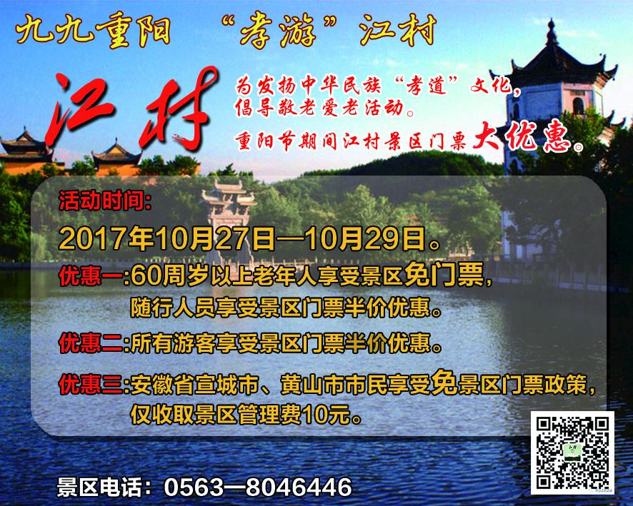 為發(fā)揚中華民族“孝道”文化,開(kāi)展敬老愛(ài)老活動(dòng)。江村景區重陽(yáng)節門(mén)票大優(yōu)惠。 活動(dòng)時(shí)間:2017年10月27日—2017年10月29日。 優(yōu)惠一:60周歲以上老年人享受景區免門(mén)票,隨行人員享受景區門(mén)票半價(jià)優(yōu)惠。 優(yōu)惠二:所有游客享受景區門(mén)票半價(jià)優(yōu)惠。 優(yōu)惠三:安徽省宣城市、黃山市市民享受免景區門(mén)票政策,僅收取景區管理費10元。 注: 1、憑有效證件在景區售票處辦理手續,如:身份證、戶(hù)口本、老年證等;      2、不重復享受景區其它優(yōu)惠政策。      3、旅行社及其他營(yíng)利組織不享受本次優(yōu)惠活動(dòng)。                                                                                                                                                                                   江村旅游有限責任公司                                 2017年10月15日      風(fēng)水寶地   名人故里----江村        鼎盛時(shí)期八萬(wàn)人口,有著(zhù)近1400年歷史的古村落,誕生了126位進(jìn)士、舉人、博士的藏龍臥虎之地。        飽經(jīng)千年世事滄桑的江村,村內牌坊、祠堂、老街、名人故居保存完好,千年古韻依舊。這里自古文風(fēng)昌盛,崇文重教,是一個(gè)日月聚秀、龍氣十足的風(fēng)水寶地。         國家4A級風(fēng)景區、中國歷史文化名村、全國重點(diǎn)文物保護單位——江村古建筑群、國家紅色旅游經(jīng)典線(xiàn)路、中國傳統村落、中國最美古村落、江澤民主席祖居地——江村歡迎您!   【聚秀風(fēng)光】 【江氏宗祠】         *關(guān)注江村旅游、了解江村風(fēng)水文化; *江村景區電話(huà):0563-8046446; *江村旅游微信公眾號:anhui_jiangcun