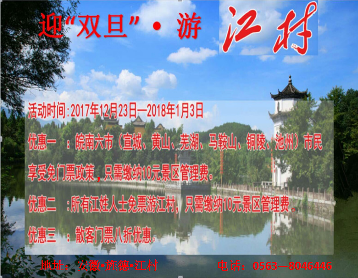 為迎接圣誕、元旦兩節的到來(lái),江村景區推出以下門(mén)票優(yōu)惠活動(dòng): 活動(dòng)時(shí)間:2017年12月23日—2018年1月3日 優(yōu)惠一  :皖南六市(宣城、黃山、蕪湖、馬鞍山、銅陵、池州)市民享受免門(mén)票政策,只需繳納10元景區管理費。   優(yōu)惠二  :所有江姓人士免票游江村,只需繳納10元景區管理費.   優(yōu)惠三  :散客門(mén)票八折優(yōu)惠。   備注: 1、憑有效證件到景區售票處辦理手續(含身份證、戶(hù)口簿、居住證、老年證等) 2、旅行社團隊及其他營(yíng)利性組織不享受本次優(yōu)惠活動(dòng)。                                                   旌德縣江村旅游有限責任公司                                                    2017.12.15