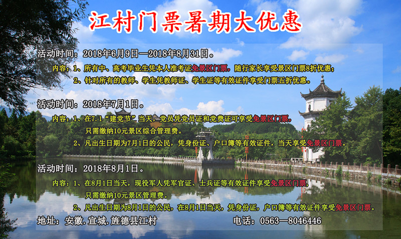 在暑假來(lái)臨之際,為了讓更多的莘莘學(xué)子對風(fēng)水寶地、名人故里——江村有更詳細的了解,進(jìn)一步增強學(xué)生對江村水口文化、孝道文化、宗譜文化、紅色文化的認識與感知,江村景區特推出一系列暑期優(yōu)惠活動(dòng)。 活動(dòng)(一):2018年6月9日—8月31日     內容:1、所有中、高考畢業(yè)生憑本人準考證免景區門(mén)票,隨行家長(cháng)享受景區門(mén)票8折優(yōu)惠。           2、針對所有的教師、學(xué)生憑教師證、學(xué)生證等有效證件享受門(mén)票五折優(yōu)惠。 活動(dòng)(二):2018年7月1日。       內容:1、為紀念中國共產(chǎn)黨建黨97周年,在7.1“建黨節”當天,黨員憑黨員證和黨費證可享受免景區門(mén)票,只需繳納10元景區綜合管理費。            2、凡出生日期為7月1日的公民,當天享受免景區門(mén)票,憑身份證、戶(hù)口簿等有效證件當天享受免景區門(mén)票。 活動(dòng)(三):2018年8月1日     內容:1、為紀念中國人民解放軍建軍91周年,在8月1日當天,現役軍人憑軍官證、士兵證等有效證件享受免景區門(mén)票,只需繳納10元景區綜合管理費。           2、凡出生日期為8月1日的公民,在8月1日當天,憑身份證,戶(hù)口簿等有效證件享受免景區門(mén)票。     風(fēng)水寶地 名人故里—江村        鼎盛時(shí)期八萬(wàn)人口,有著(zhù)近1400年歷史的古村落,誕生了126位進(jìn)士、舉人、博士的藏龍臥虎之地。    飽經(jīng)千年世事滄桑的江村,村內牌坊、祠堂、老街、名人故居保存完好,千年古韻依舊。這里自古文風(fēng)昌盛,崇文重教,是一個(gè)日月聚秀、龍氣十足的風(fēng)水寶地。 【學(xué)生研學(xué)簡(jiǎn)影】         *關(guān)注江村旅游、了解江村風(fēng)水文化; *江村景區地址:安徽省宣城市旌德縣白地鎮江村; *江村景區電話(huà):0563-8046446; *江村旅游微信公眾號:anhui_jiangcun