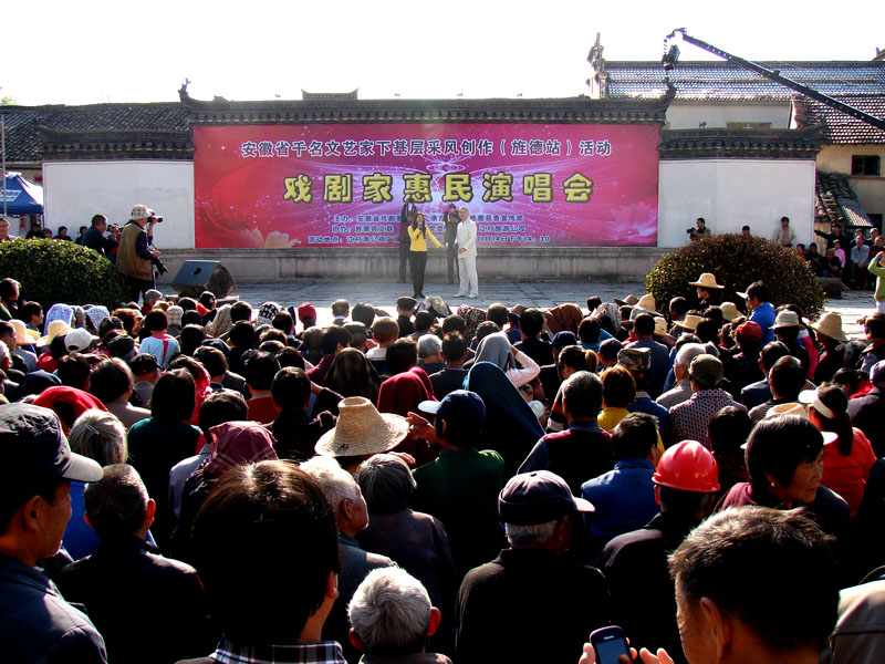 這場(chǎng)演出是安徽省戲劇家協(xié)會(huì )到旌德縣開(kāi)展主題為“我們的沃土我們的夢(mèng)”千名文藝家下基層采風(fēng)活動(dòng)的“省戲劇家惠民演唱會(huì )”,參加演出的十位演員都是國家一級演員。