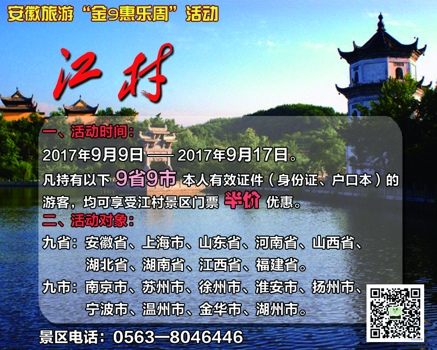 安徽旅游“金9惠樂(lè )周”活動(dòng)江村景區門(mén)票大優(yōu)惠