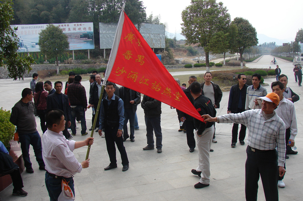 2011年4月1日,江村景區迎來(lái)了一批共60余人的特殊的客人,他們是廣東番禺沙涌村江氏后裔(明代江永慶的后輩),特別趕在清明節前夕來(lái)江村認祖的。此次認祖團隊的組織者叫江始雄,乃沙涌村江詒燕堂負責人。之前一直聽(tīng)說(shuō)自己的祖上是浙江奉化和江西的,后來(lái)聽(tīng)村里的老人說(shuō)是安徽旌德江村的。就這樣江始雄于2005年10月份帶領(lǐng)村里的9名江氏后裔踏上了旌德江村認祖的道路,并贈送了錦旗,之后又于2007年、2009年共三次來(lái)旌德江村祭祖,這次是第四次了,他說(shuō)爭取每?jì)赡陙?lái)江村一次。此次龐大的認祖團隊得到了沙涌村書(shū)記江少泉、村長(cháng)江展行大力支持,二位村領(lǐng)導也隨團來(lái)到了旌德江村。 這次來(lái)江村認祖的近60名江氏后裔,基本上是第一次來(lái)旌德江村,原本安排景區導游引獅山古廟、聚秀湖路途景點(diǎn)一路講解,可是大家認祖心切,等不及的要趕到祠堂參觀(guān),大家首先來(lái)到他們祖上祠堂(溥公祠)瞻仰祖宗像,因江始雄先生先后來(lái)江村3次,與溥公祠檢票員江丕俄老先生多次交談過(guò)(2005年來(lái)江村尋宗的時(shí)候,就是江老找出了金鰲江氏家譜廣東番禺沙涌江氏這一支系的詳細記錄),并請江老取出了祖宗像的真跡請大家瞻仰,大家的心情非常的激動(dòng),其場(chǎng)面無(wú)以言表。之后沙涌村的村長(cháng)向江村旅游公司贈送錦旗:金鰲后輩、重游祖地。