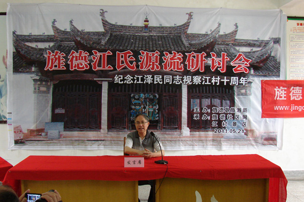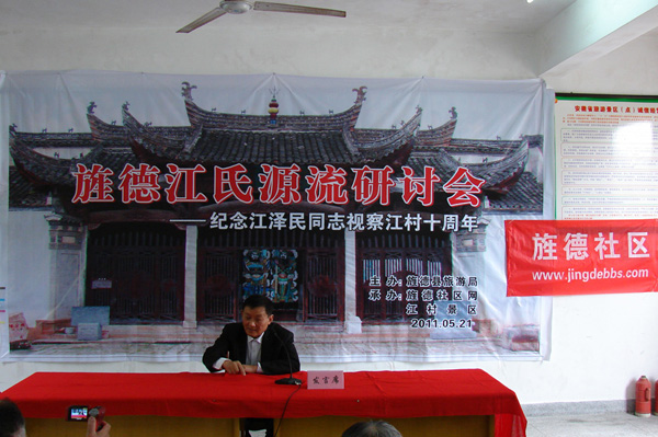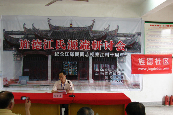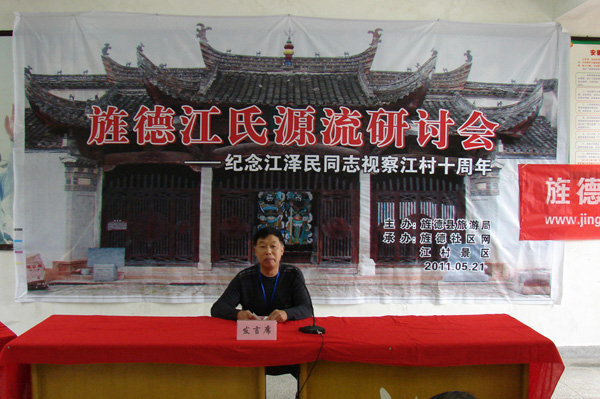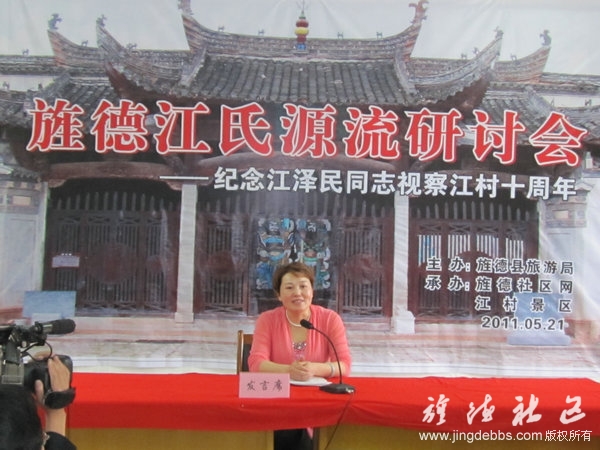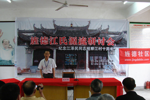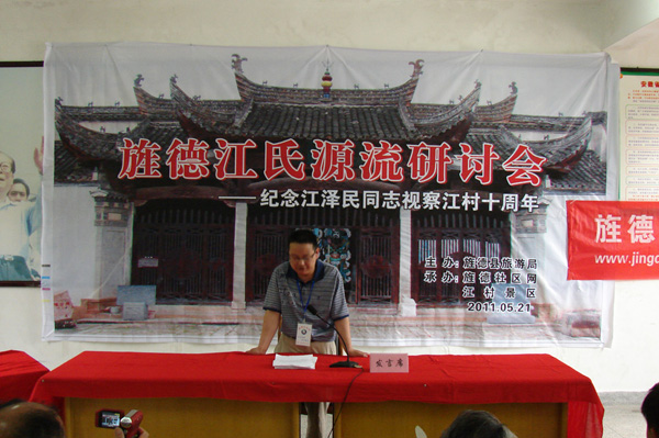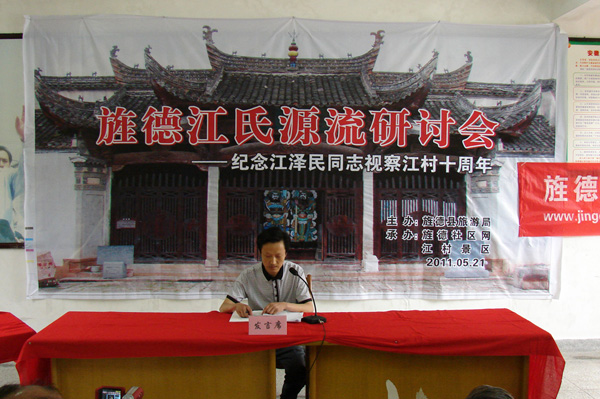 2011年5月21日上午,旌德縣圍繞“研討江氏源流,發(fā)展江村旅游”這一主題,在中國歷史文化名村、 全國重點(diǎn)文物保護單位、國家AAAA級旅游景區、江澤民同志祖居地——江村隆重舉辦“旌德江氏源流研討會(huì )暨江澤民同志視察旌德江村十周年活動(dòng)”。一批來(lái)自全國各地熱忱于歷史文化研究的專(zhuān)家學(xué)者和旌德社區網(wǎng)友共30余人參加研討會(huì ),旌德縣人民政府副縣長(cháng)孫愛(ài)華致歡迎詞。此次研討會(huì )由旌德縣旅游局主辦、旌德社區網(wǎng)、江村景區承辦,旌德縣旅游局局長(cháng)劉四清主持。
